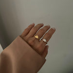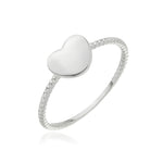 Anel feminino prateado com aro detalhado e coração liso no centro. Esse anel é um mimo de tão delicado!