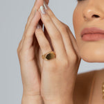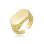 Anel feminino dourado de formato quadrado detalhado e regulável.