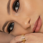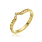 Anel feminino dourado com um V central cravejado com zircônias. Uma dica: o Anel Val fica perfeito combinando com o Anel V no mesmo dedo pois eles se encaixam.