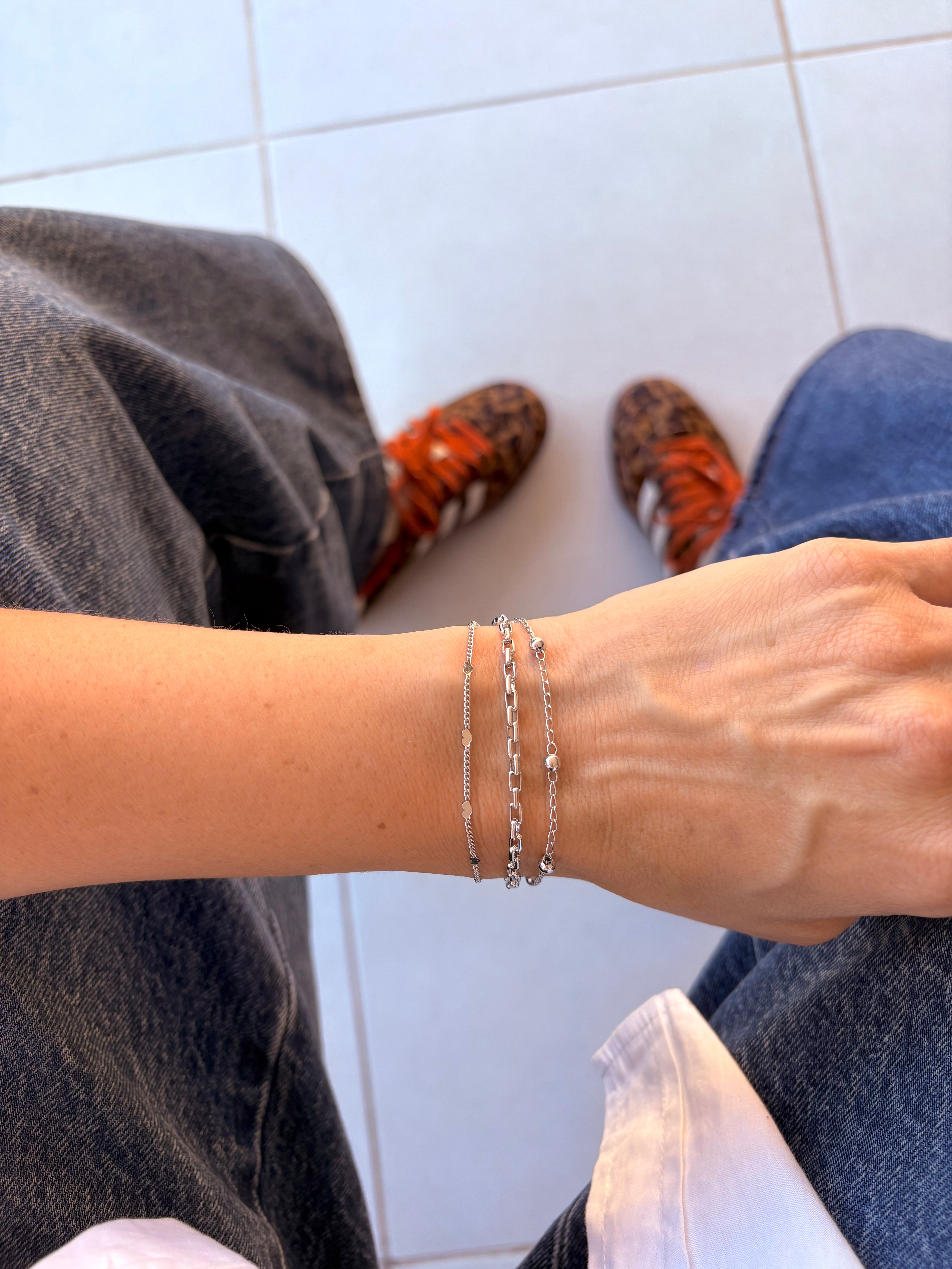 Pulseira feminina prateada de corrente veneziana fininha com coracõezinhos chapados.